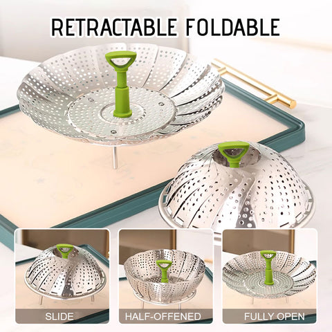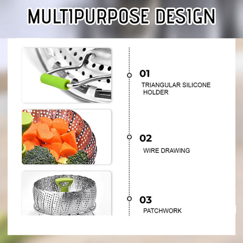 - Parannettu muotoilu ja laatu - höyrystimessä on korkealaatuinen terälehti muotoilu, joka on valmistettu elintarvikekelpoisesta ruostumattomasta teräksestä, elintarvikekelpoisesta muovikahvasta ja silikonijaloista, jotka takaavat terveytesi. Höyrystäminen on terveellinen ruoanlaittomenetelmä, koska siinä säilyy yli 90 % ravintoaineista, jotka menetetään, kun ruokaa keitetään tai lämmitetään uudelleen mikroaaltouunissa. Kokoontaitettavaa höyrystintä voidaan käyttää vihannesten, merenelävien, munien, lihan, jälkiruokien, vauvanruoan jne. höyrystämiseen.