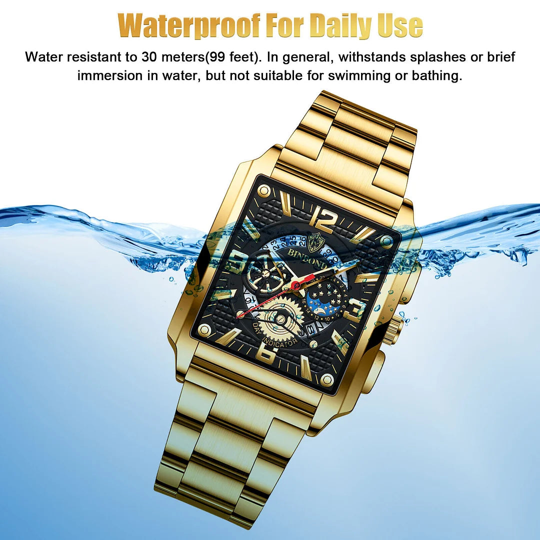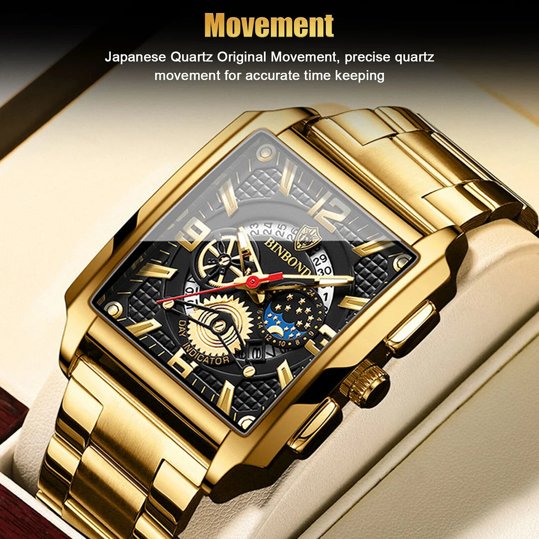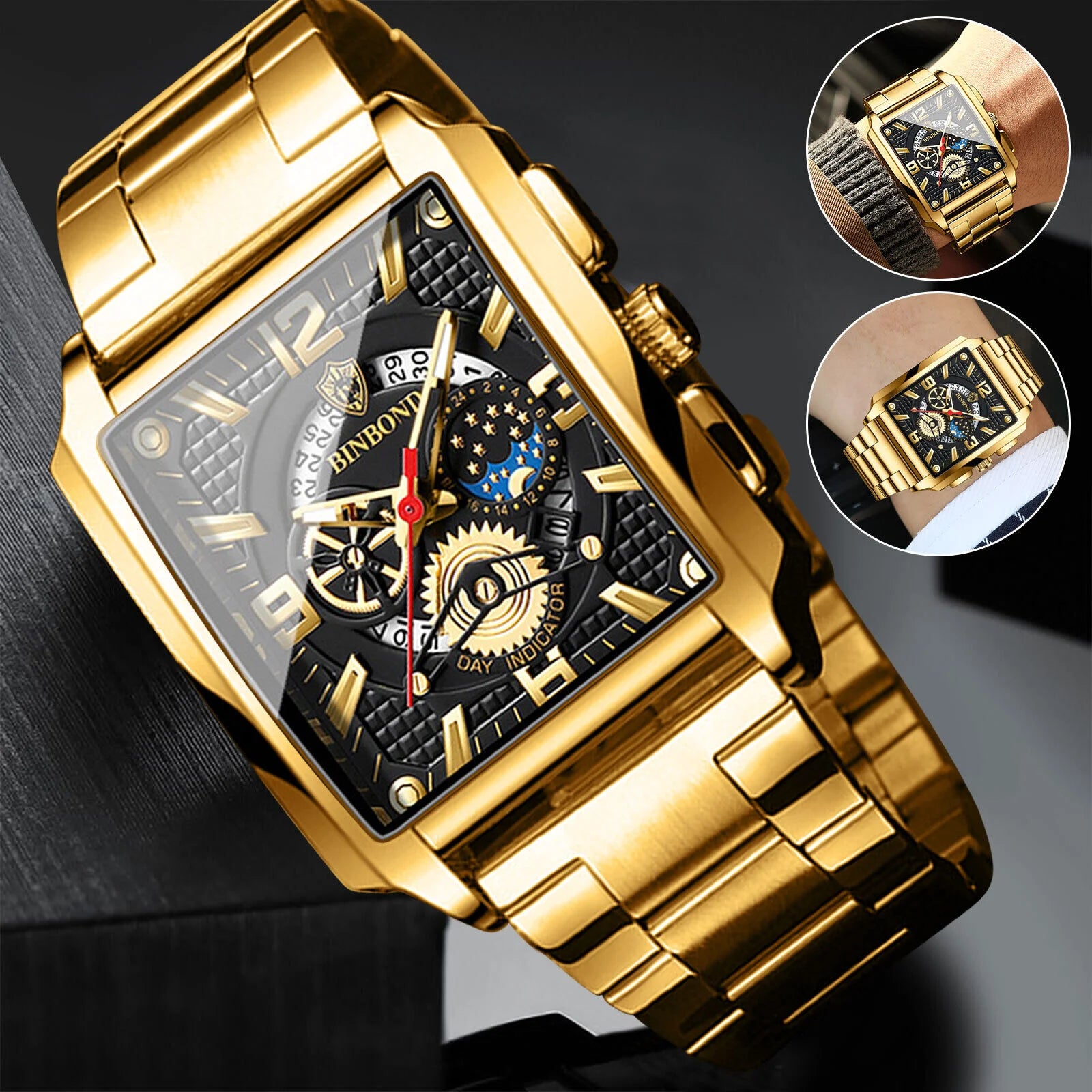 Ruostumaton teräskello: Trendikäs kultainen neliömallinen kotelo, täydellinen yhdistelmä vapaa-ajan ja tyylin välillä, yksinkertainen ja tyylikäs. Sopii ranneeseesi täydellisesti, on mukava käyttää, ja ranneke on hengittävä ja vedenkestävä.